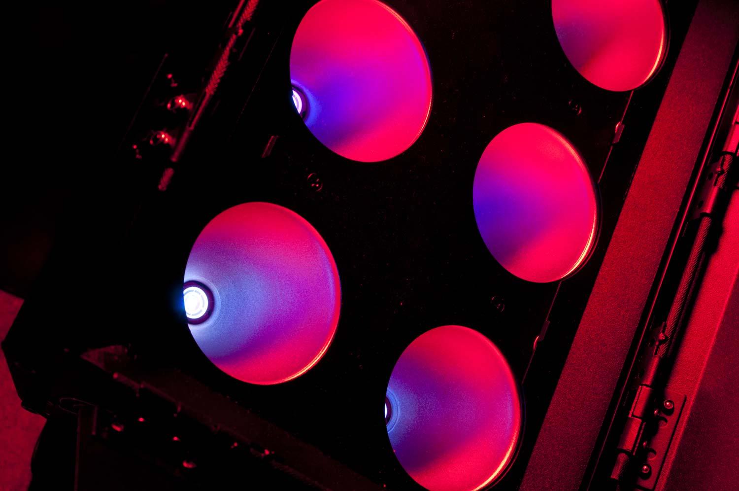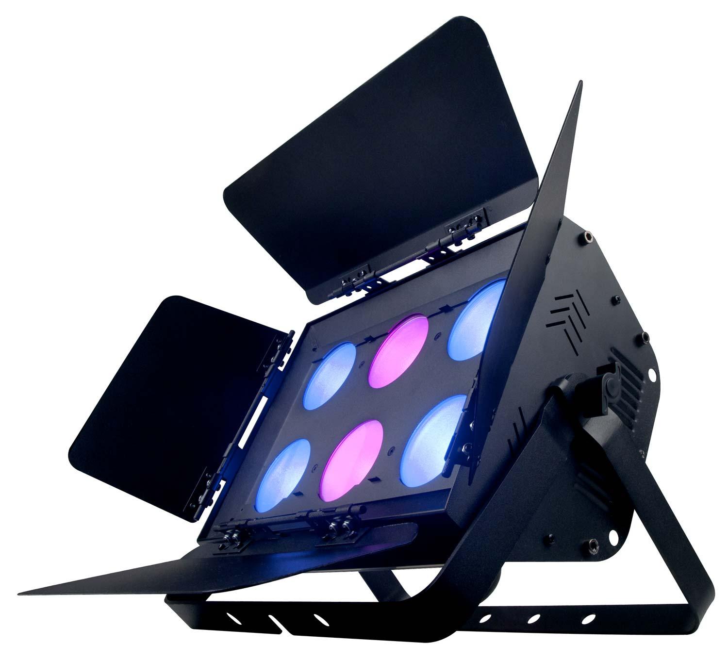 • Wash/Blinder fixture with six COB TRI LEDs (RGB: 3-IN1): 2 x 3 COB LED matrix panels