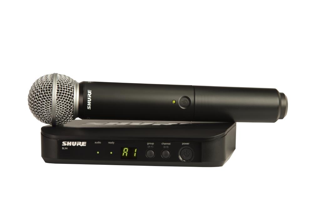 The Shure BLX24/SM58-H9 is a wireless handheld microphone system in the H8 frequency band (518-542 MHz) that comes with a BLX4 single channel wireless receiver and dynamic cardioid BLX2 SM58 vocal microphone.